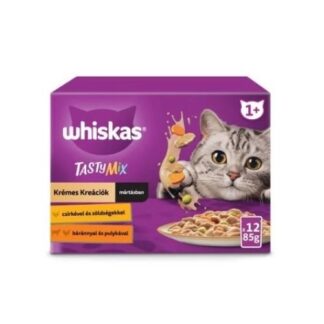 A WHISKAS alutasakos Tasty Mix krémes nedveseledel válogatás felnőtt macskák számára, 1 éves kortól. Ízletes, krémes állagú falatok, amelyek teljes értékű táplálást biztosítanak minden szükséges vitaminnal és ásványi anyaggal.